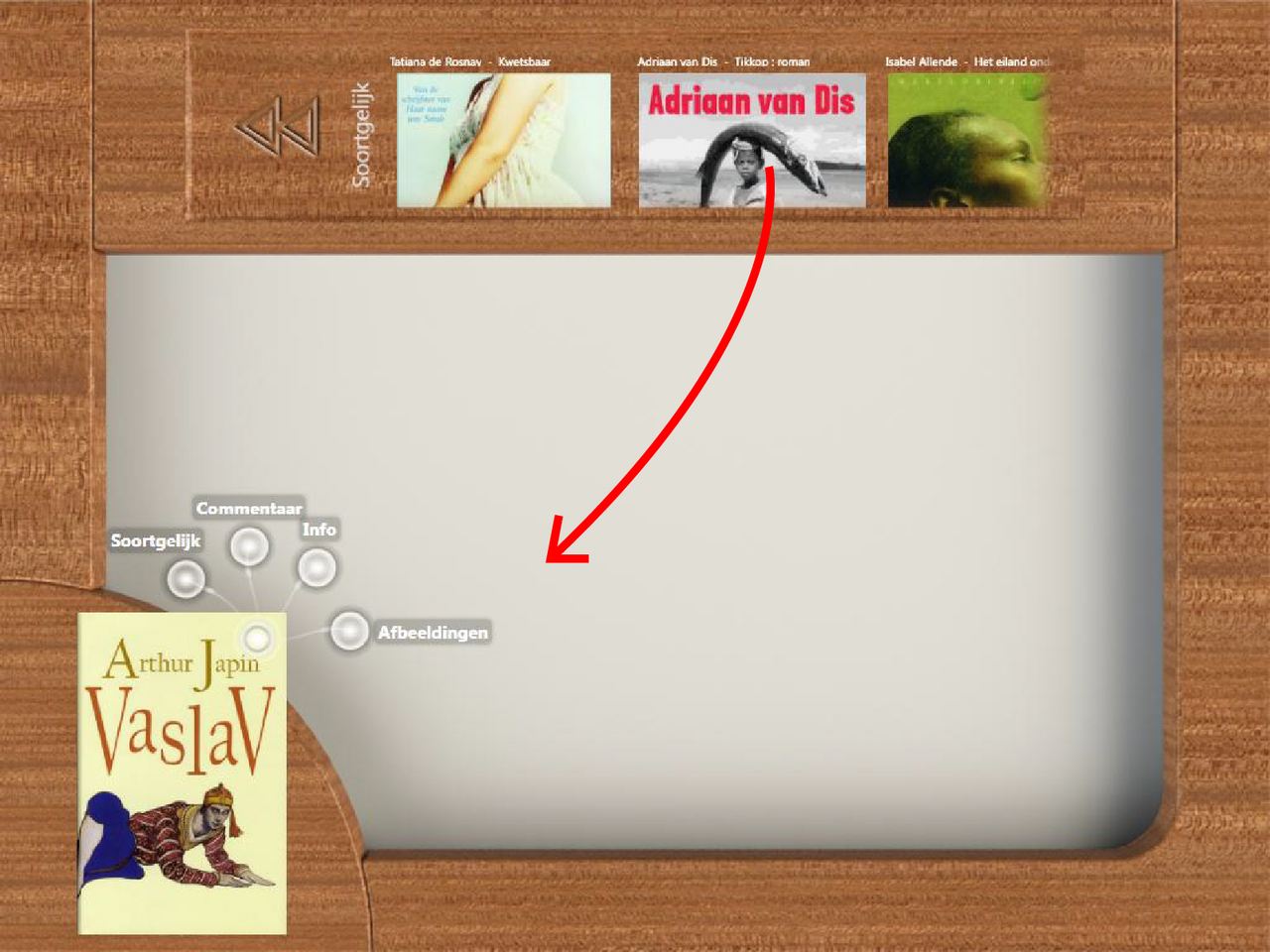 The application is built for the Microsoft Surface platform, which enables multi-touch and multi-user computing on various hardware devices. The interface of the application has been specifically designed to enable exploration of data from various relevant information sources. The user can obtain an overview of available reviews and comments but also multimedia content such as images and videos. Because of the connection with the catalogue of the library the interface can also present up-to-date information about the book, for example where the book is located. It is also possible to find related books based on the lending history of other clients. These related books can then also be explored.
