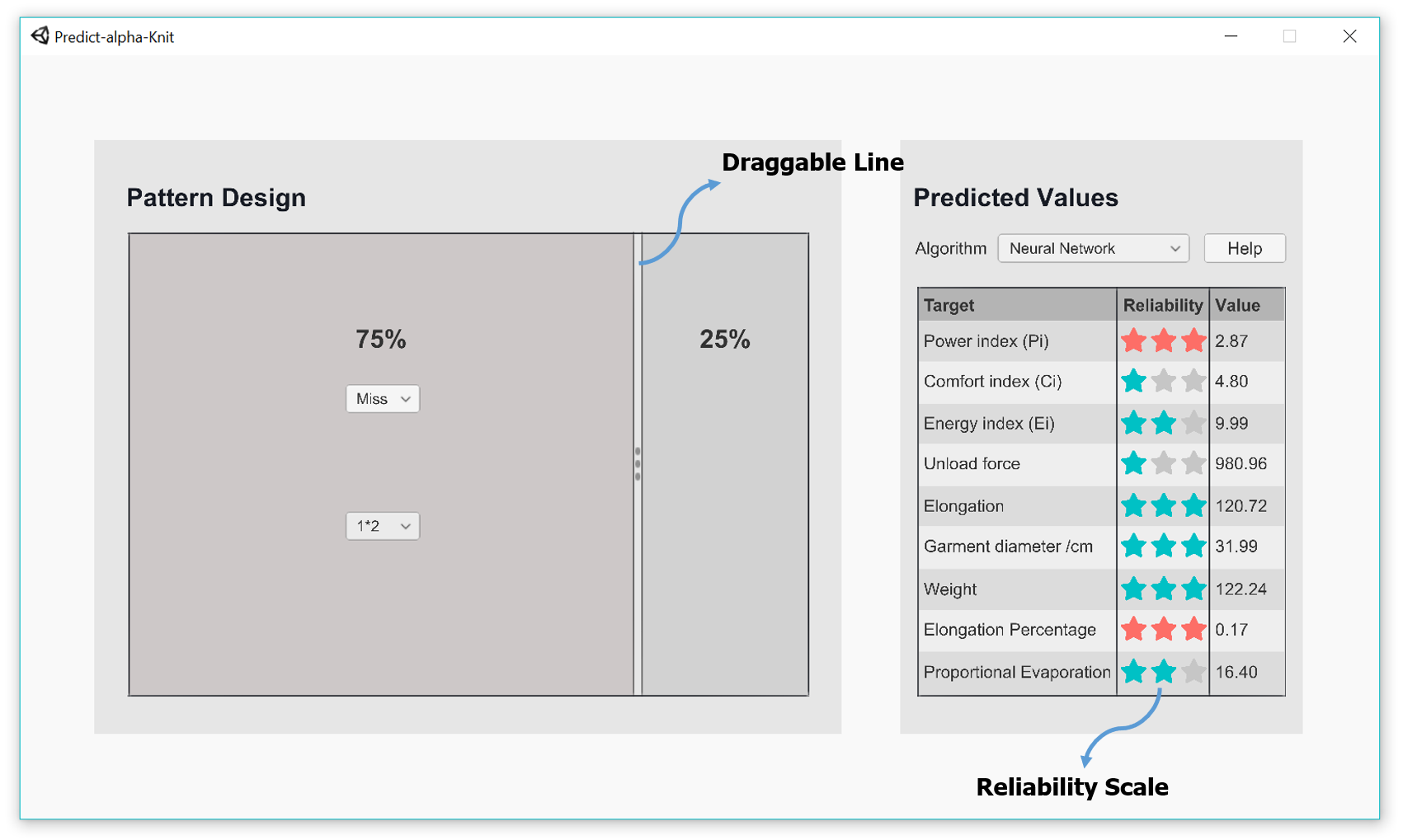 This approach focused on predicting a fabric’s functional properties. We systematically produced 36 unique knit samples, varying key parameters like stitch type and structure. These samples then underwent rigorous lab testing to quantify performance metrics like compression, weight, comfort, and evaporation. We used this dataset to train machine learning algorithms, resulting in a prototype with a simple 2D interface. This tool allows designers to select knitting parameters and receive instant numerical feedback on the predicted performance, helping to optimize a garment’s functionality without creating physical samples.