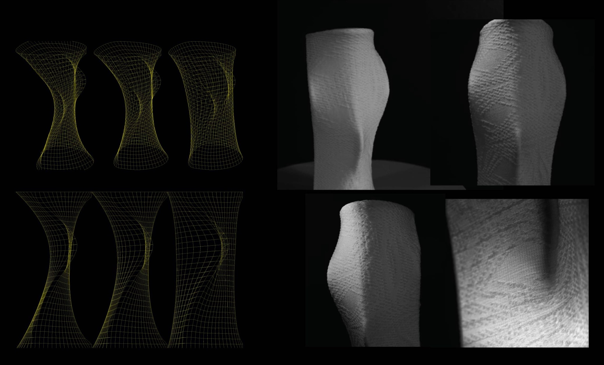 This resulted in a 3D parametric simulation that gives designers an intuitive way to work with the complex forms that emerge from stretched textiles. This form-finding tool was successfully applied to design a 3D knitted lamp, which artfully uses the changes in density and light transmittance of the fabric under tension.