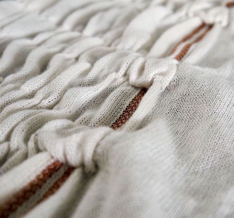 The fabric developed for Tender is a structural knit textile with pockets. Each pocket can incorporate a programmable microchip and at the same time work as a diffuser for the LED light. The back side of the pockets contain a surface from conductive thread that can be used as stretch sensor or capacitive touch sensor.